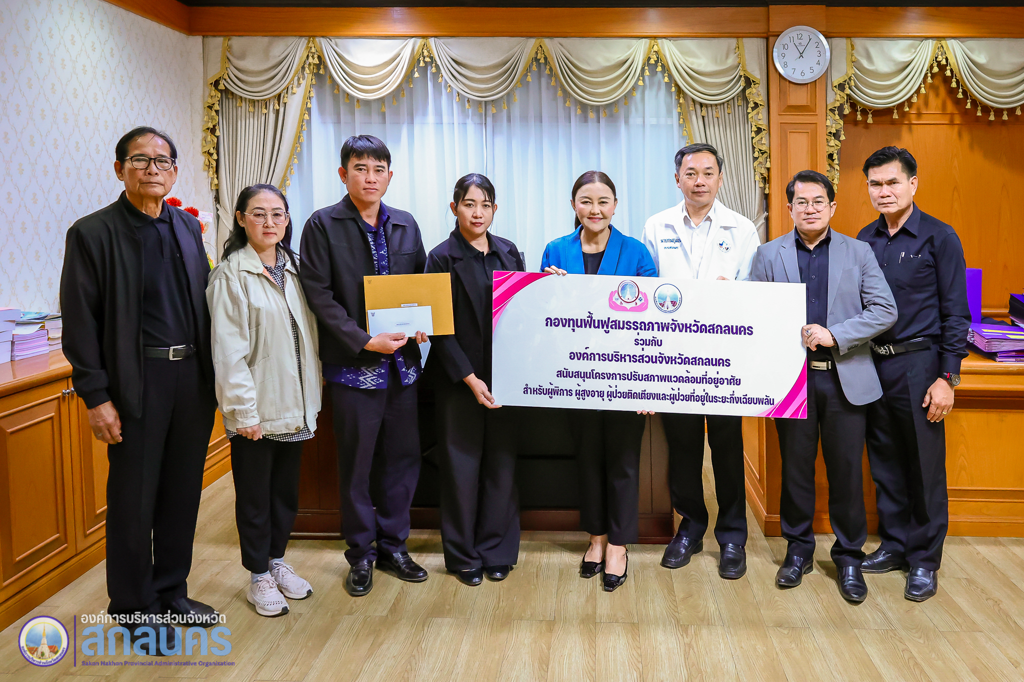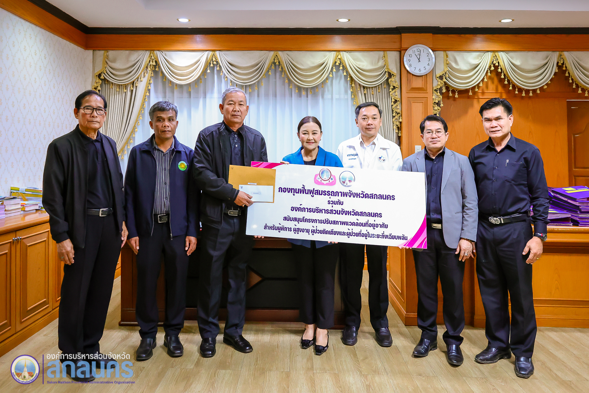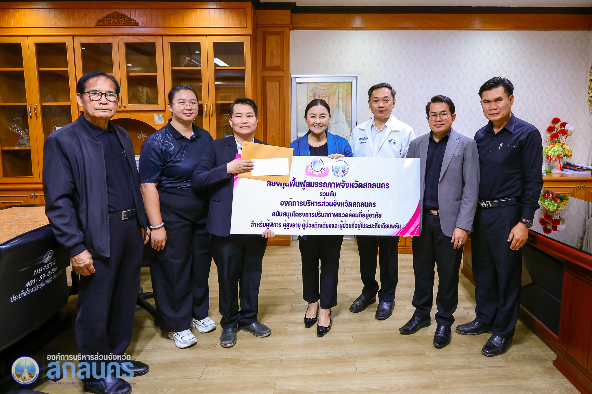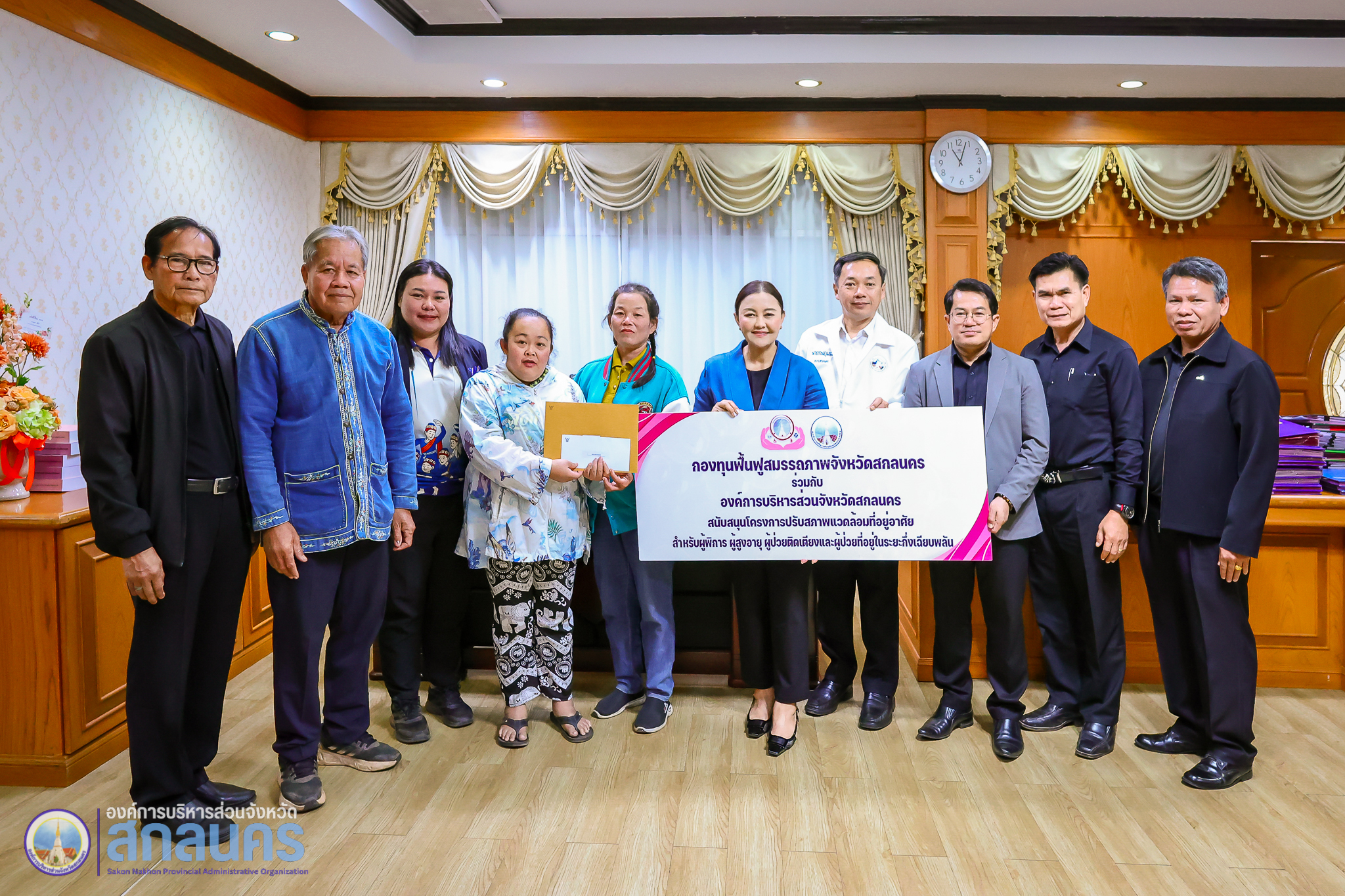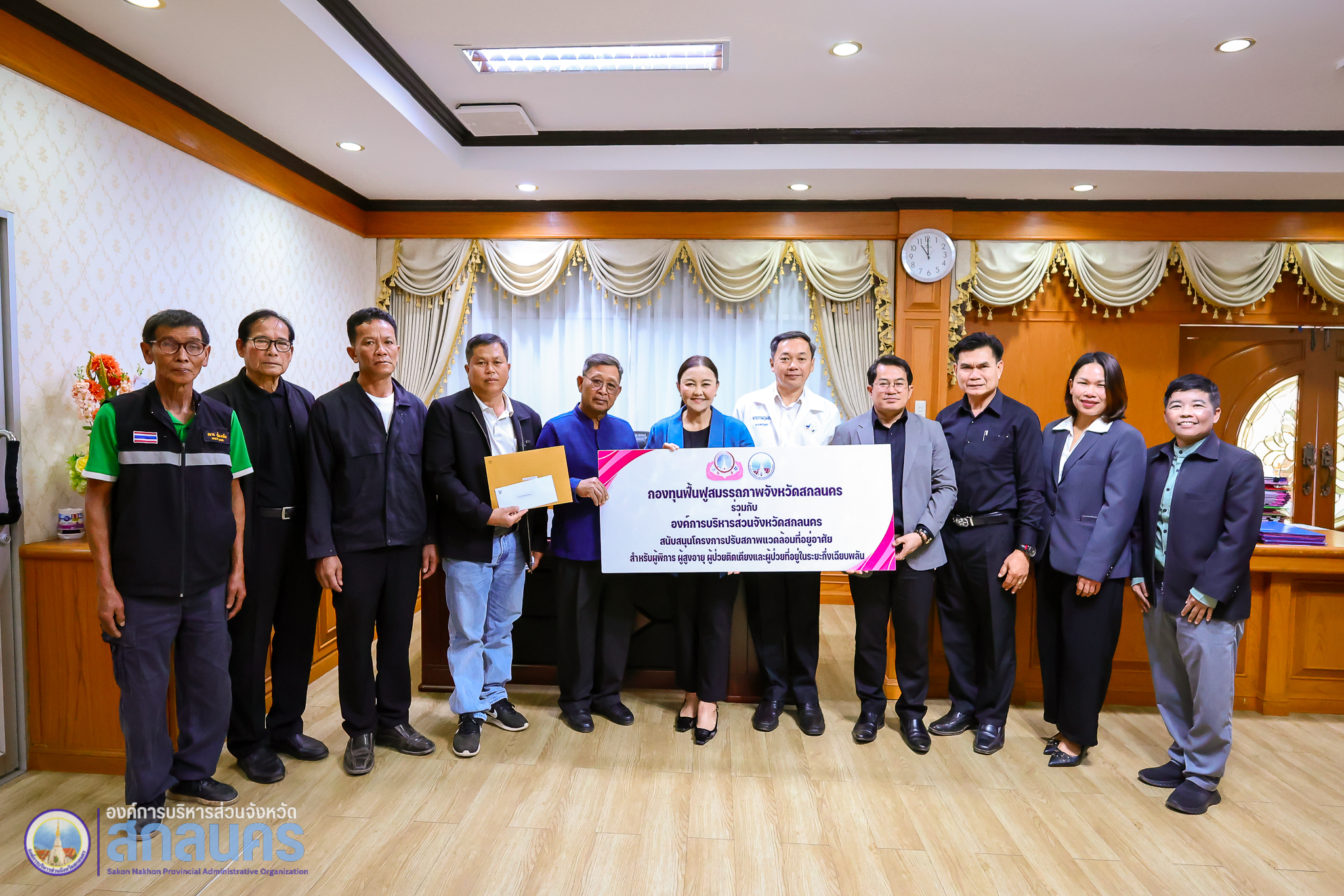 องค์การบริหารส่วนจังหวัดสกลนคร โดย นางนฤมล สัพโส นายกองค์การบริหารส่วนจังหวัดสกลนคร พร้อมด้วยรองนายกองค์การบริหารส่วนจังหวัดสกลนคร ปลัดองค์การบริหารส่วนจังหวัดสกลนคร ที่ปรึกษานายกองค์การบริหารส่วนจังหวัดสกลนคร และผู้อำนวยการกองสาธารณสุข ร่วมมอบทุนสนับสนุนจากกองทุนฟื้นฟูสมรรถภาพจังหวัดสกลนคร ประจำปีงบประมาณ พ.ศ. 2569